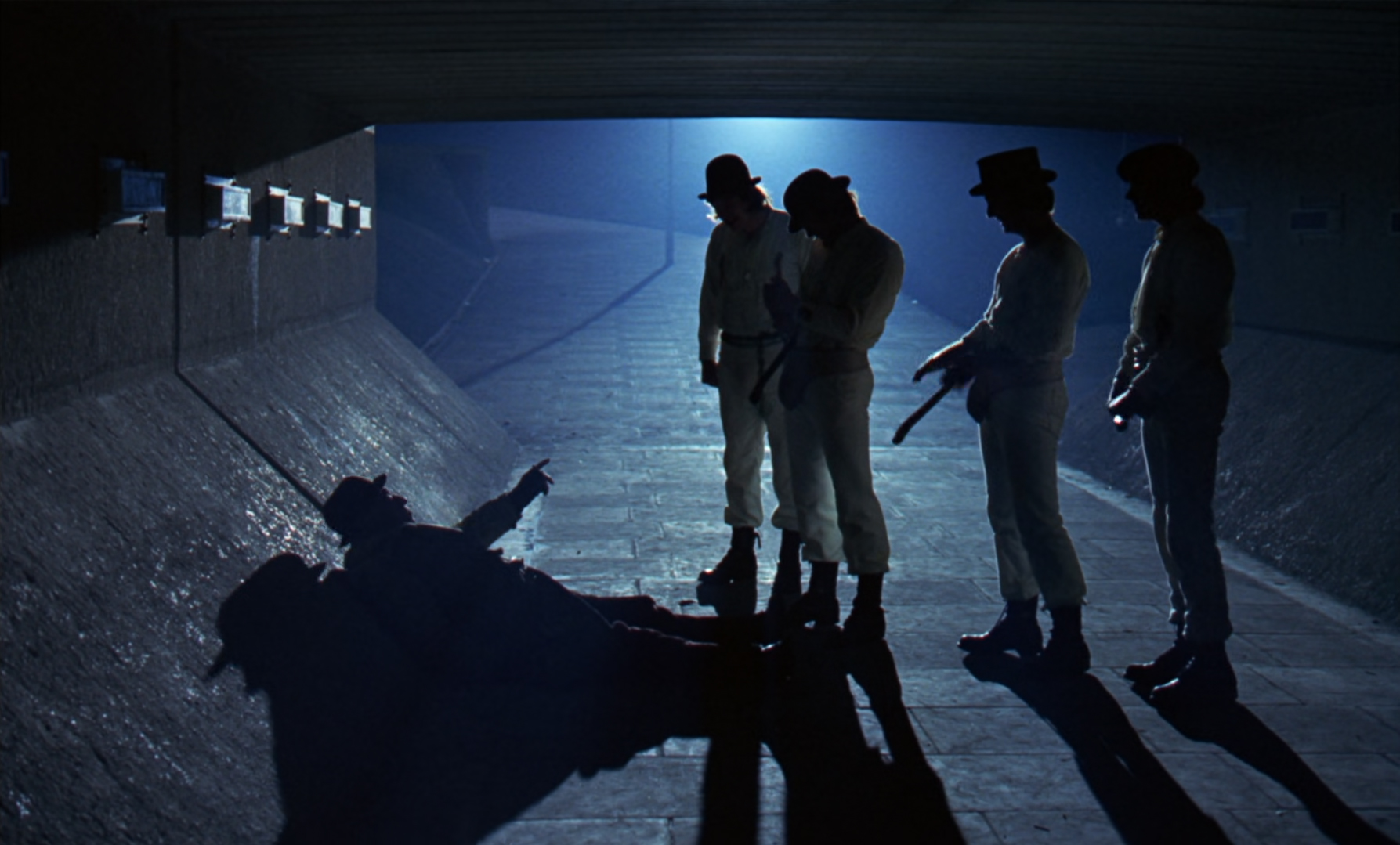 En cambio, “La naranja mecánica” es mucho más difusa con esos conceptos. Mientras que en el joker vemos como el personaje va “convirtiéndose” desde el comienzo del film de un ciudadano enfermo pero positivo y trabajador a un asesino maniático, la sociedad de la naranja mecánica ya parece arrancar perdida. El por qué sucede lo que sucede queda fuera de campo, está en el supuesto pasado de los personajes que uno puede intentar imaginar, pero nunca definir. La violencia de Alex y sus amigos, presente desde el comienzo del film, es ya algo que no depende de la corrupción policial o política. El mundo ya perdió.